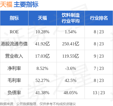 天福港股市值41.92亿港元,在饮料制造行业中排名第8。主要指标见下表: